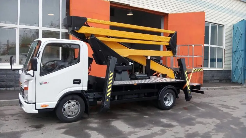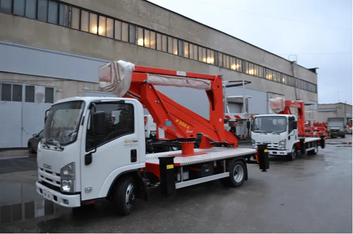ХарактеристикиАвтомобильная вышка позволяет осуществлять подъём на высоту до 20 метров. Максимальный горизонтальный вылет равен 8,4 м. Важным элементом подъёмника является 2-местная корзина грузоподъёмностью 230 кг. Управление осуществляется с земли или из люльки. Для этого используется специальная гидравлическая система. В корзине имеется розетка 230 В. Предусмотрена подача воды и воздуха.