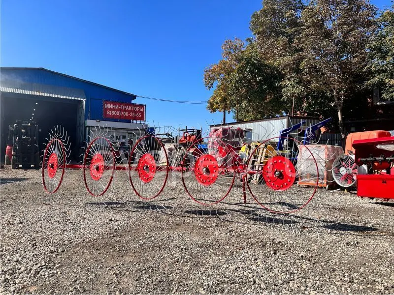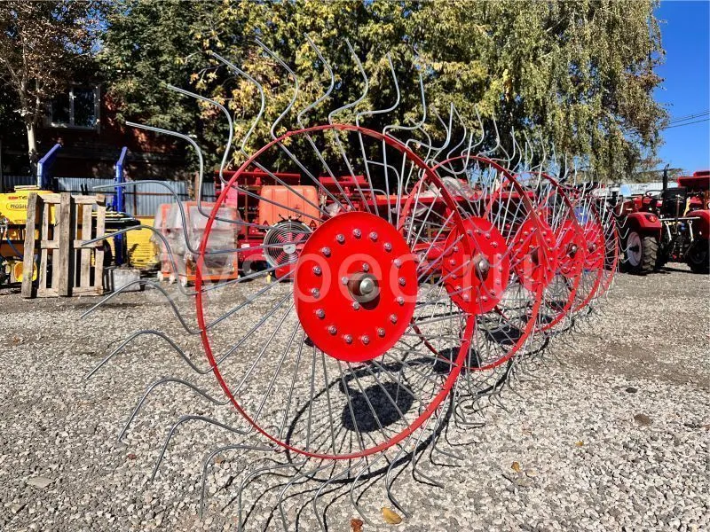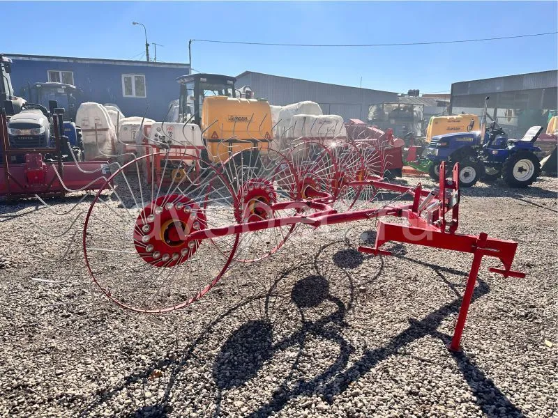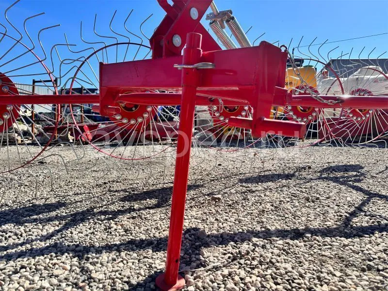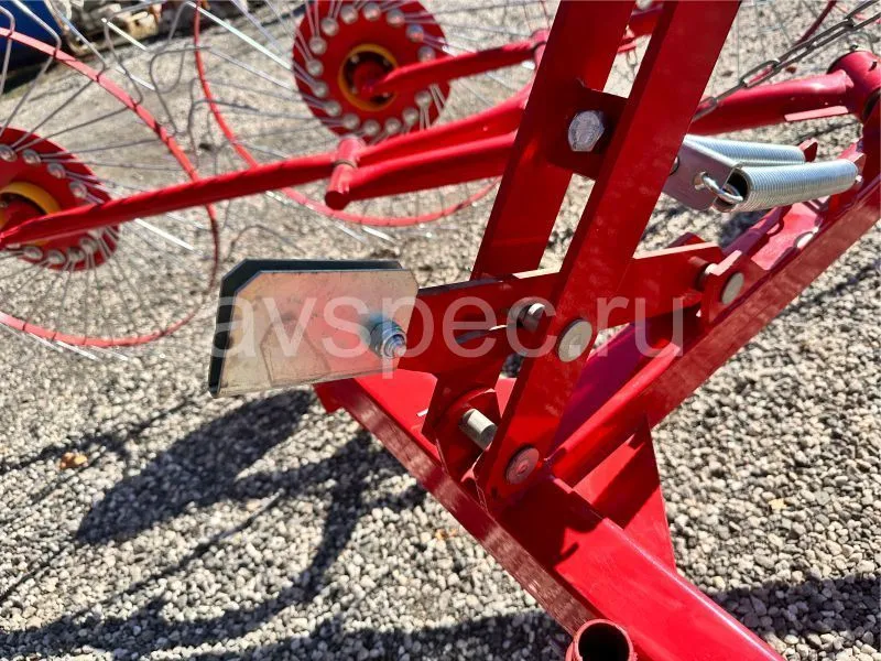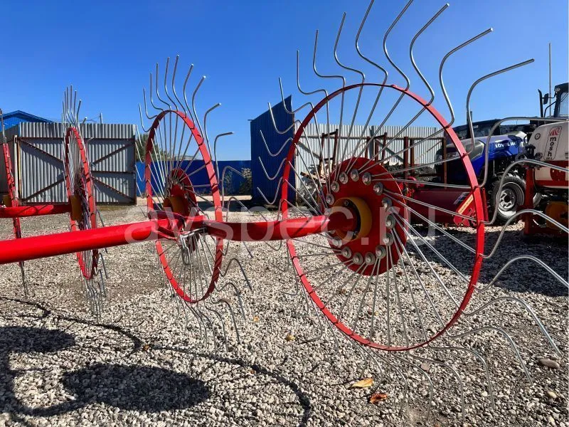 Данный агрегат не нужно соединять с ВОМ трактора. В рабочем положении его колеса опираются изогнутыми «лучами» на поверхность поля, и естественным образом приводятся во вращение во время движения трактора. В контакте с поверхностью поля одновременно находится 4-5 лучей каждого из пяти колес. В зависимости от выставленного положения агрегата, вращаясь, они ворошат и переворачивают зеленую массу, либо собирают её в валки. Несмотря на простую конструкцию, механизм работает с травой практически без пропусков.