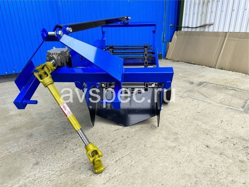 Это инструмент для выкапывания картофеля с ножом, лентой и колесами. Нож вырезает землю с клубнями и отправляет их на транспортерный механизм. Тот в свою очередь поднимает и раскладывает картофель на поверхности для сбора. Длина транспортера 600 мм. Устройство соединяется с трактором, минимальная мощность которого 18 л.с. со сцепкой и ВОМ.