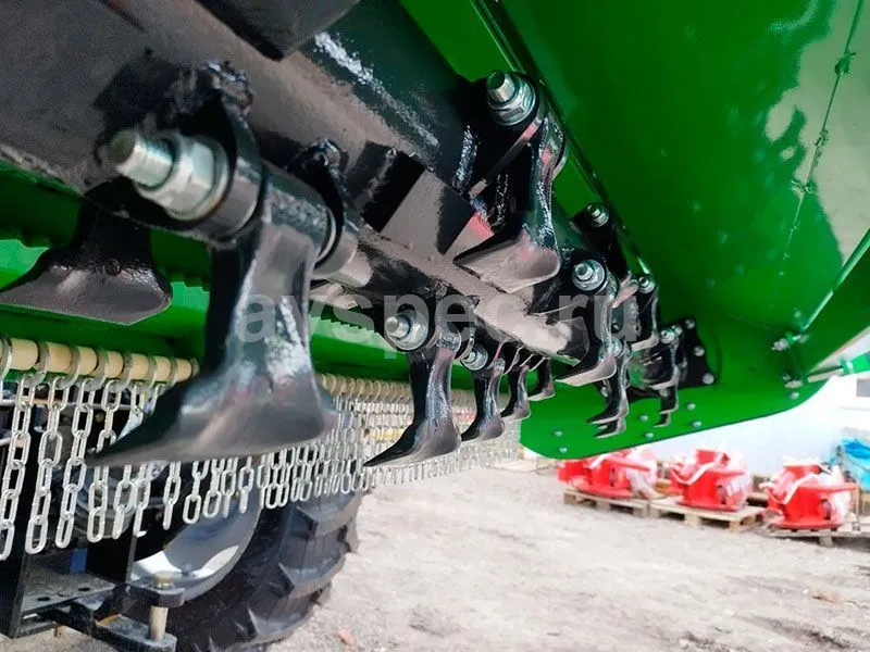 В передней части мульчера установлена штора, состоящая и ряда тяжёлых цепей, предотвращающих выбрасывание измельчаемого материала.