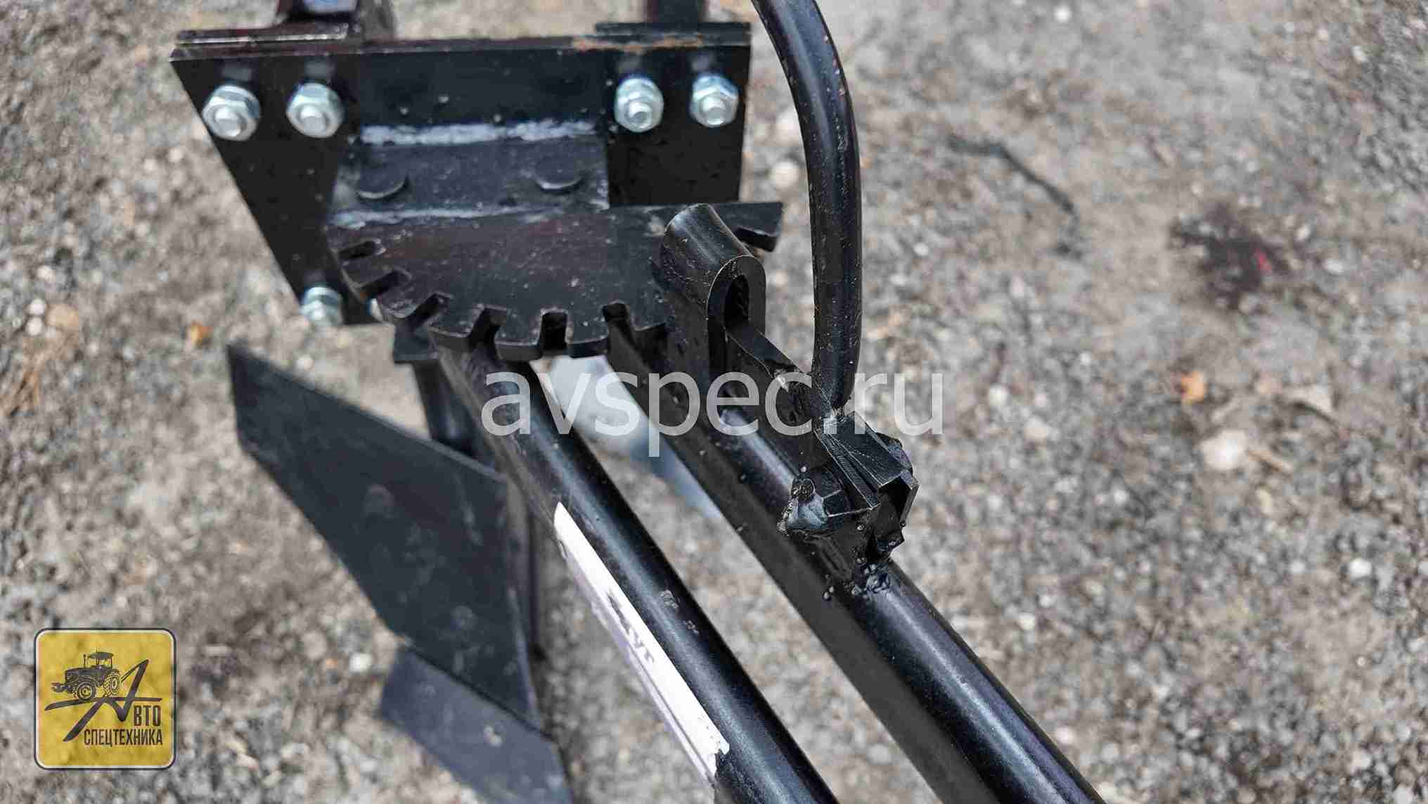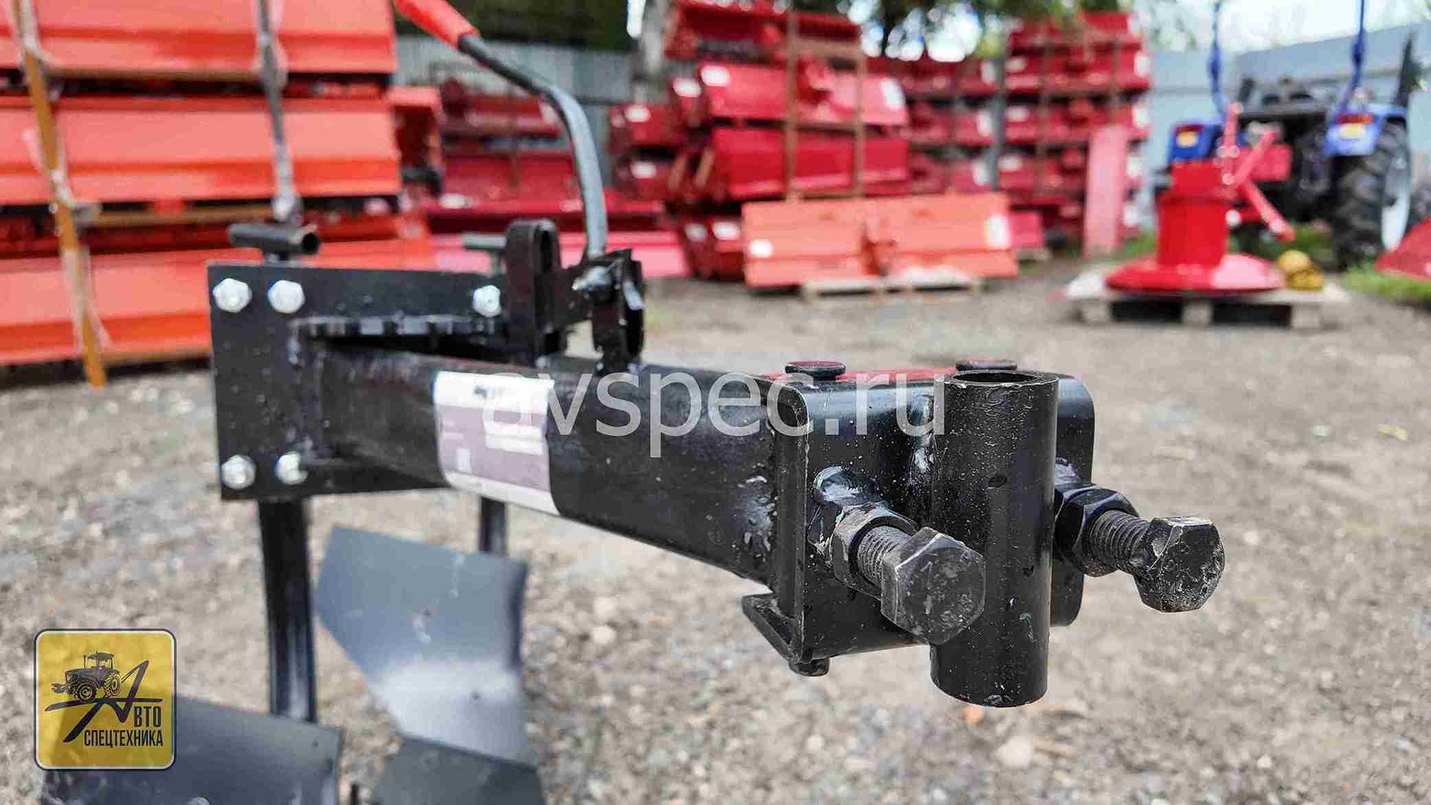 Настройка угла поворота лемеха достигается с помощью регулировки винтового стержня и закрепления гайкой.