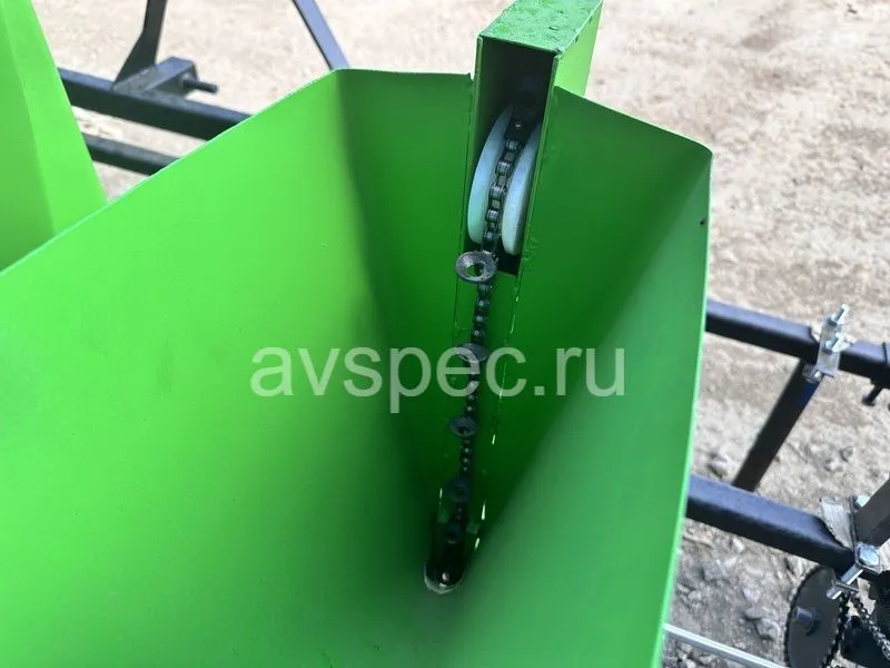 Для обеспечения стабильной работы на неровной почве применена двовальная система механизма дозирования с разделенным приводом. Шаг посадки в ряду: 110 мм, 125 мм, 140 мм, регулируется изменением передаточного числа на цепном редукторе. Для компенсации длины цепи использован натяжитель. Сошник и заделки регулируемые, глубина посадки 60-80 мм. Ширина междурядий регулируется в пределах 200–530 мм.