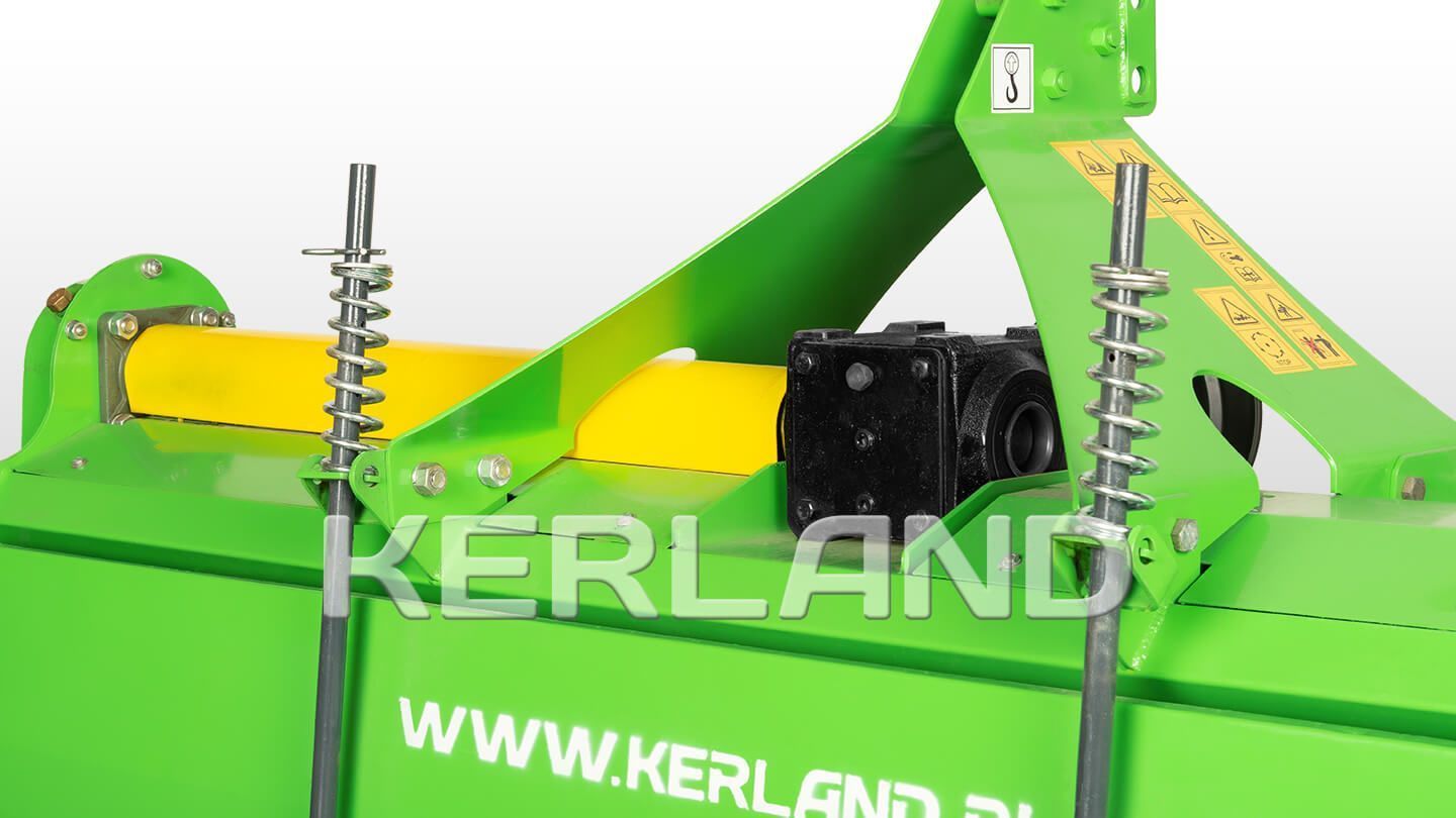 Рабочий вал почвофрезы с установленными на нём 32 изогнутыми ножами через редуктор приводится в действие валом отбора мощности трактора, и вращается в сторону, противоположную направлению движения по полю. Это позволяет агрегату более качественно рыхлить и выравнивать землю, разрушать корни сорняков и измельчать пожнивные остатки ранее выращивавшейся культуры. В состав конструкции почвофрезы Керланд K 1800 входят следующие узлы и детали: