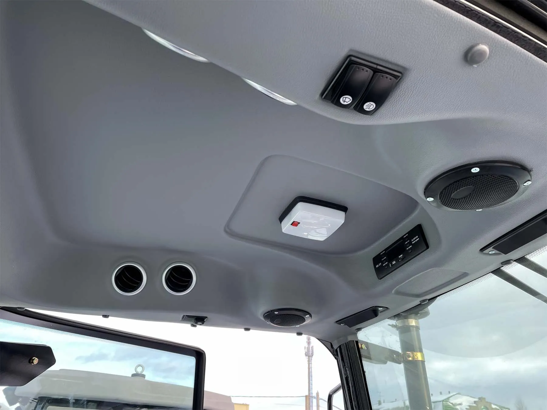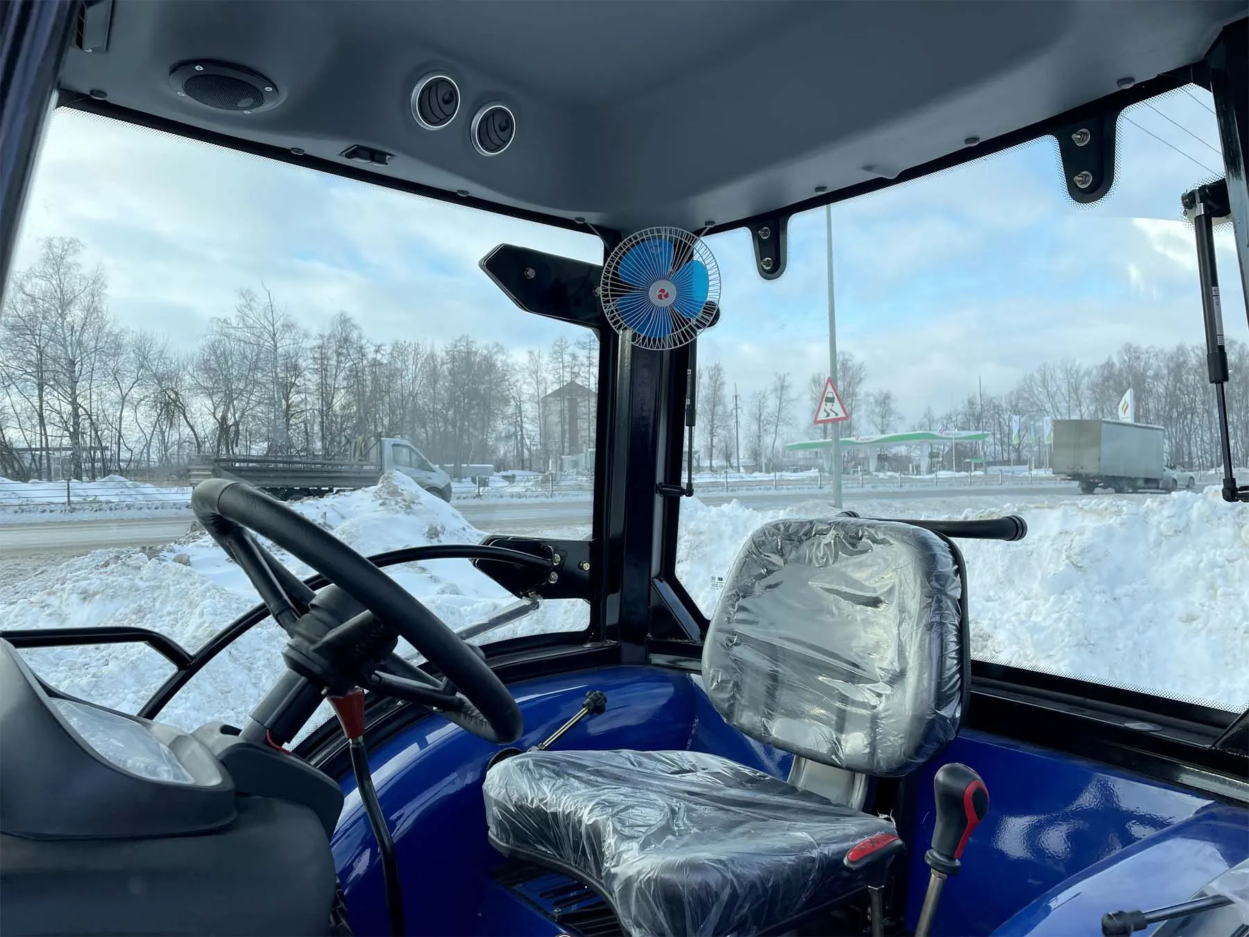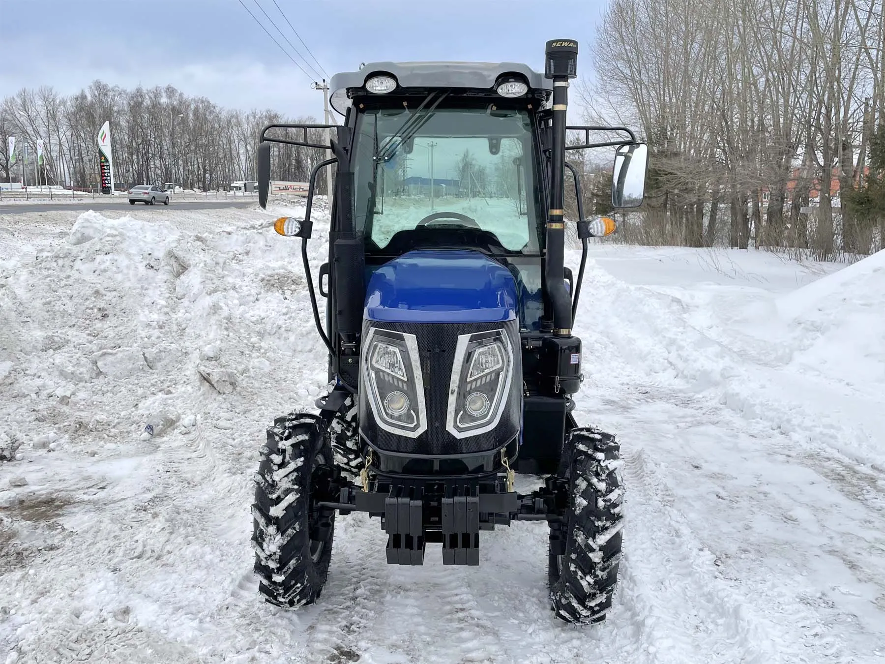 Установленная на тракторе кабина соответствует требованиям сертификации OECD и отличается современным европейским дизайном. Панорамное остекление обеспечивает водителю удобный обзор, а наличие отопителя ‒ комфортные условия работы в холодную погоду.