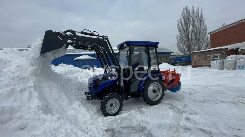 На трактор установлена щетка и погрузчик.