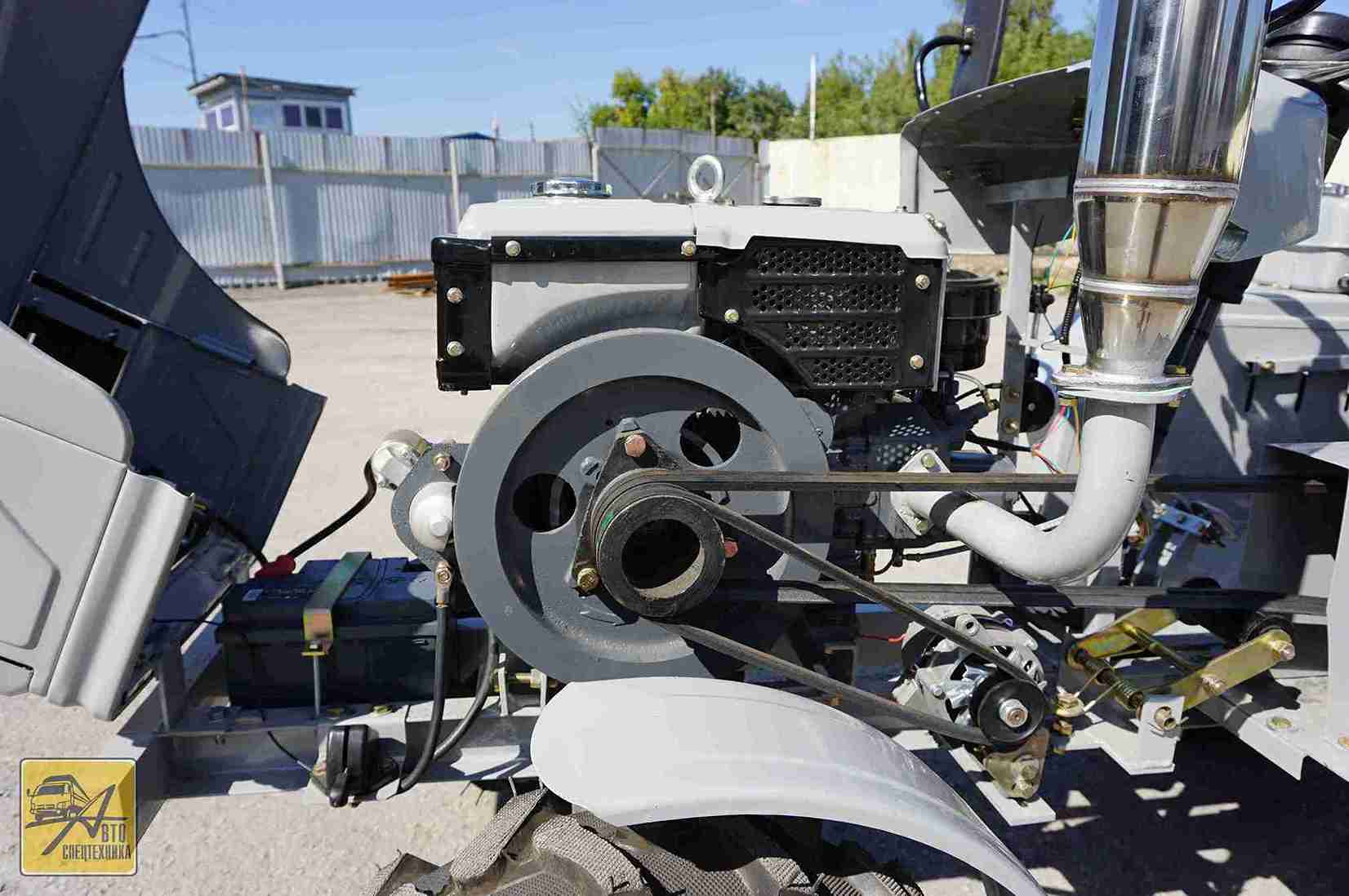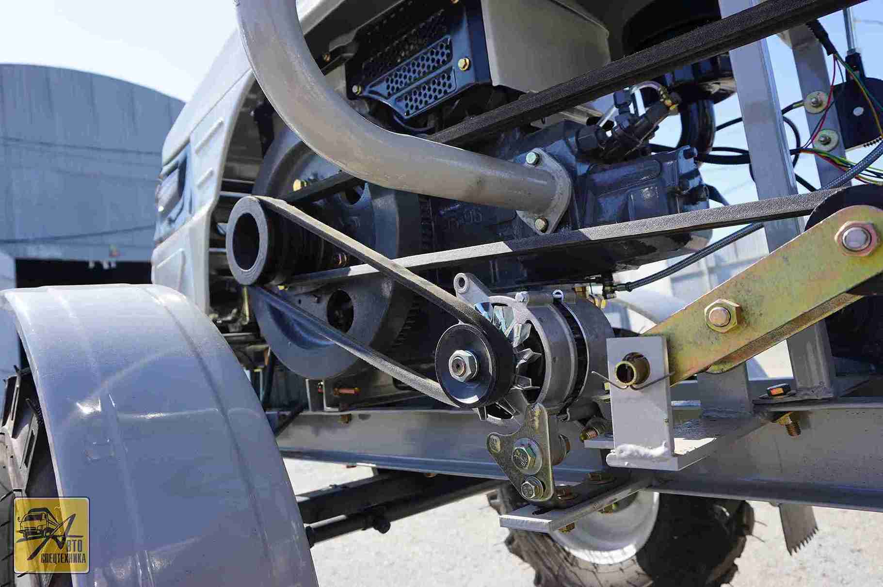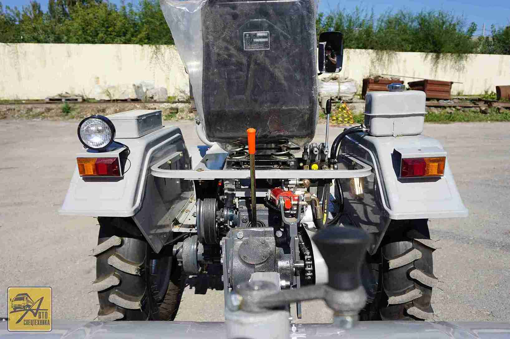Трансмиссия — механическая коробка передач. У неё 6 передач вперед и 2 назад. Это позволяет подобрать оптимальный режим для любой задачи. Ременный привод обеспечивает плавность хода. Он снижает нагрузку на двигатель. Есть блокировка дифференциала. Она повышает проходимость в сложных условиях.