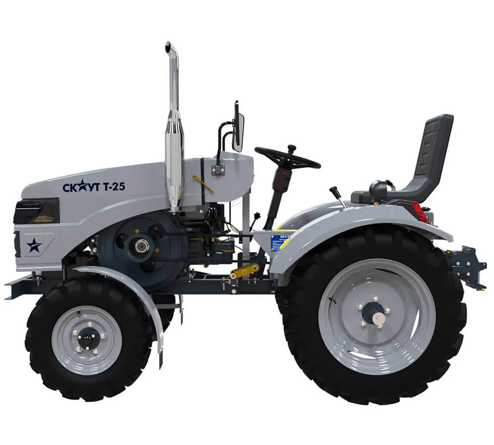 Трактор Скаут Т-25 является одним из наиболее передовых образцов техники модельного ряда Скаут. Это флагман поколения, с максимальной комплектацией и улучшенными характеристиками. Работоспособность и характеристики при нагрузках были проверены Санкт-Петербургским аграрным университетом. Так, были проведены тесты нагрузок на тяжелых почвах, испытания на стенде для определения динамических и тяговых показателей, определены максимальные значения углов опрокидывания.