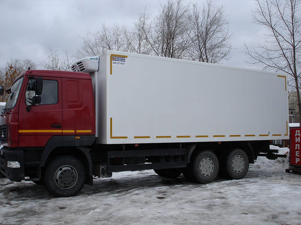 Тушевоз МАЗ 6312В5 машина для перевозки тушь в подвешенном состоянии в Самаре. Это грузовой автомобиль с полной массой 26 500 кг, и грузоподъёмностью фургона 13 000 кг. Обратите внимание на грузоподъёмность тушевоза она ниже чем фургона и составляет примерно 9 000 кг. Оборудован рефрижераторной холодильной установкой для поддержания отрицательной температуры.